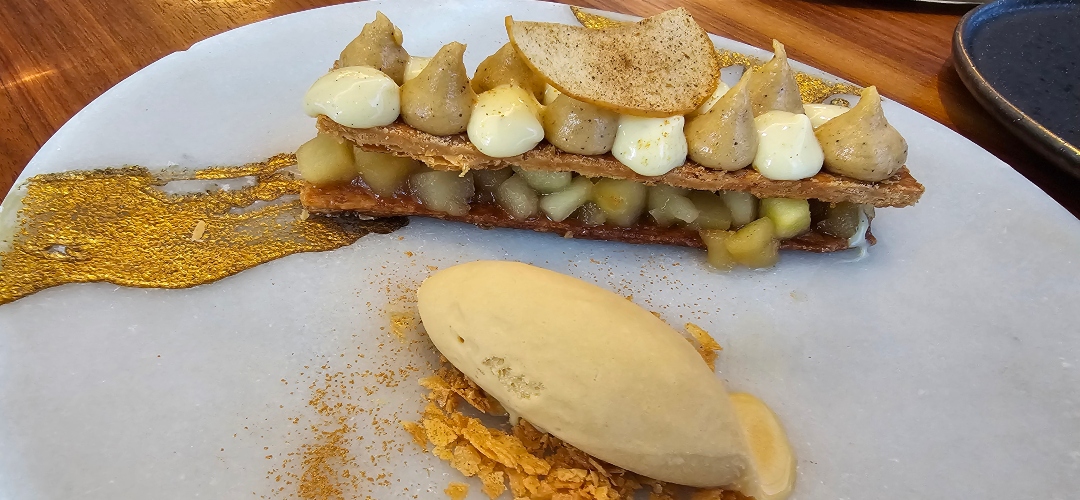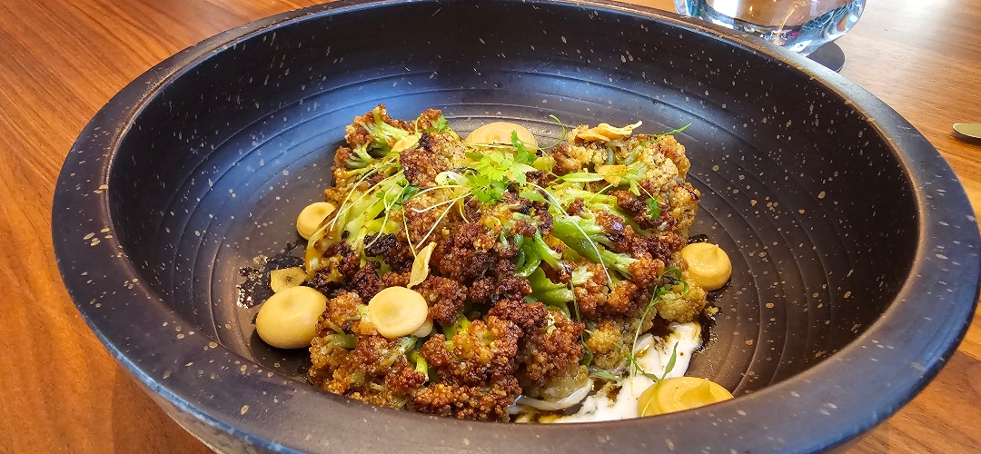 Entre las novedades de esta temporada, la tortilla abierta de huevos camperos, caviar y gamba roja ejemplifica esta filosofía: una tortilla ligeramente cuajada solo por una cara, al estilo de Sacha, coronada con caviar Oscietra y gamba roja, y acompañada de crema agria y cebolla pochada. El chipirón de anzuelo, cocinado en dos cocciones —el cuerpo a la brasa y las patitas al estilo andaluz— se sirve sobre una delicada vichyssoise de puerro y Dashi, con cebolla fresca y coronado por emulsiones de cebollino y de su propia tinta, ofreciendo un juego de texturas y sabores sorprendente. Y la coliflor china frita y glaseada, acompañada de yogur especiado, hummus de alubia blanca, lascas de queso Comté, tajín y un toque de ralladura de lima, aporta frescura y profundidad, una combinación que seduce desde el primer bocado.