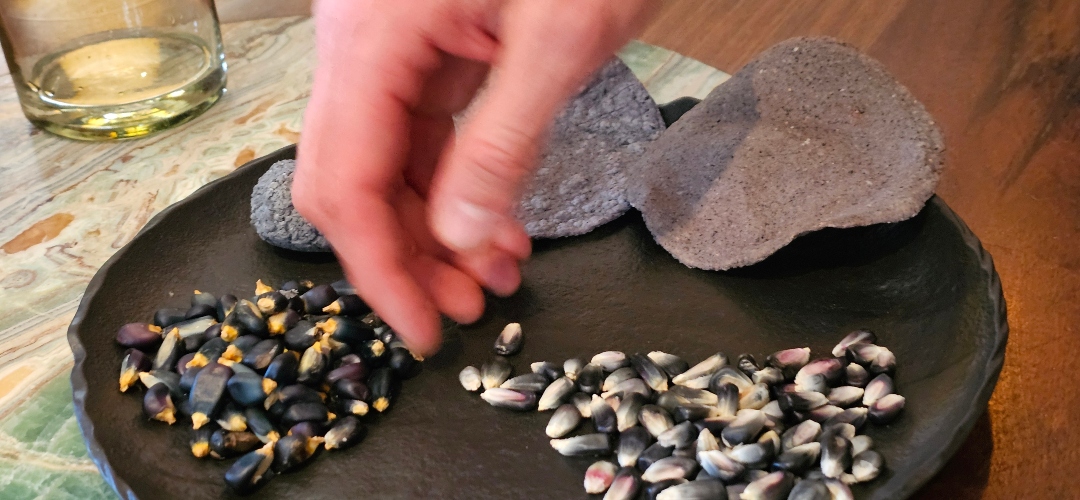 Aquí, todo gira en torno a tres pilares: el maíz, la leña y el mezcal. La nixtamalización —técnica ancestral clave en su cocina— marca el punto de partida de cada elaboración. Las tortillas, hechas al momento con maíz azul criollo chalqueño, destacan por su sabor profundo y su textura, elevando cada taco a otro nivel.