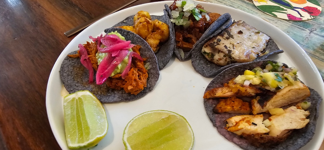 La propuesta combina tradición y creatividad con opciones como el taco de verduras con mole negro y queso de cabra, el pollo al pastor o la quesadilla de chorizo, junto a elaboraciones más especiales como la flauta de pollo o las rajas poblanas a la crema. También hay espacio para versiones más ligeras, como los tacos envueltos en lechuga con langostinos o lubina.