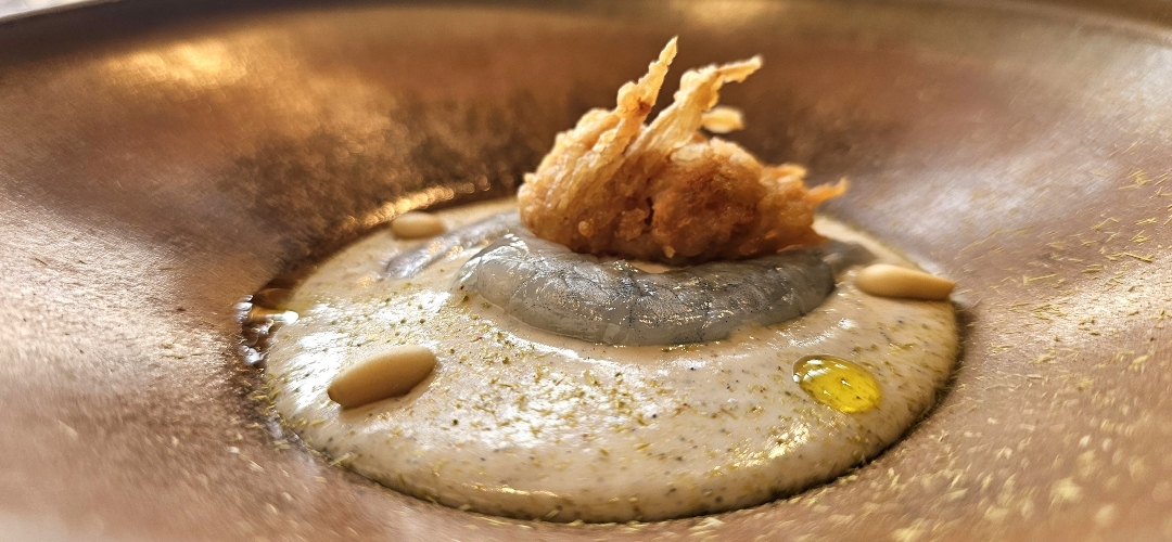 La cocina de Caleña demuestra también un claro compromiso con los productores locales y la economía de la región, muestra de ello es el plato Langostino-pino-Piñón. en el que el langostino de Medina de Noray es uno de los protagonistas.