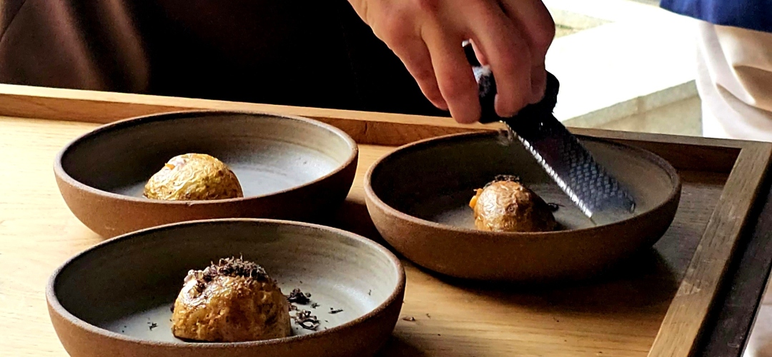 Pero, si hay un plato emblemático de Ávila, sin duda son las patatas revolconas. Patatas-Torreznos-Trufa (un manjar) es el homenaje del chef a un plato tan querido y arraigado a la zona. Para su preparación reservan la piel de la patata, que se presenta sobre una mezcla de la propia patata, cebollas pochadas, torreznos crujientes, pimentón de la Vera, yema de huevo y trufa negra.