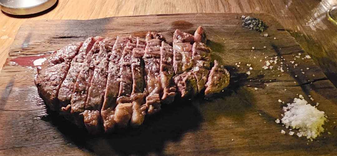 La propuesta culinaria gira en torno a dos pilares: carnes premium y mariscos frescos. El restaurante funciona como un steakhouse de alta gama, con cortes selectos como Kobe, Wagyu o Creekstone Farms, preparados con técnicas que buscan potenciar el sabor y la textura del producto.