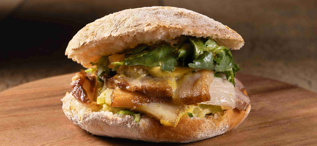 Mollete de ibérico, berza aliñada y mahonesa de especias. Armoniza con Ramón Bilbao Reserva 2018 y Torres 20 Mule, de Torres Brandy.