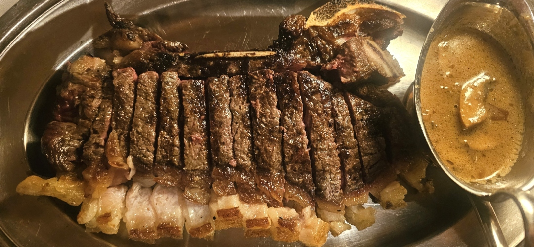 El corazón de esta nueva etapa es el Bistec Bar, un concepto que devuelve al bistec su ritual clásico de bistró. Cada comensal puede personalizar su plato eligiendo corte, salsa y guarnición. Las carnes —solomillo de cerdo ibérico, solomillo de vaca, chuleta de lomo bajo de vaca, trasero de pollo de grano de Las Landas, salmón o la jugosa hamburguesa de vaca madurada en pan brioche— se preparan a la parrilla y se sirven en fuentes clásicas, recién cortadas, listas para compartir.