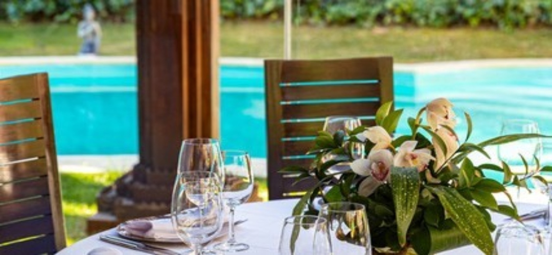 El espacio exterior está concebido como un auténtico oasis urbano. La vegetación frondosa envuelve cada mesa, las piscinas decorativas aportan frescura y movimiento, y la disposición de los distintos rincones permite encontrar desde zonas más íntimas hasta mesas abiertas pensadas para grupos. Todo está cuidado al detalle, con una estética elegante donde las flores —orquídeas, arreglos tropicales y composiciones delicadas— refuerzan ese aire sofisticado que define el conjunto.
